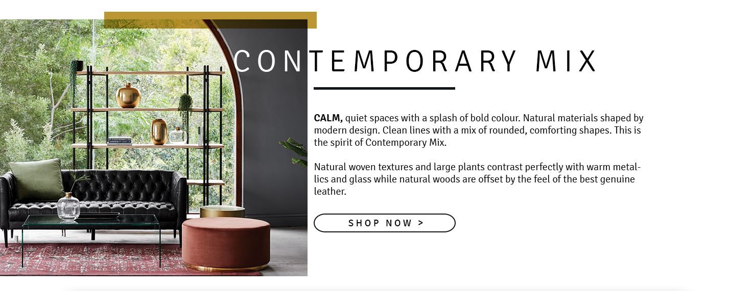 Calm, quiet spaces with a splash of bold colour. Natural materials shaped by modern design. Clean lines with a mix of rounded, comforting shapes. This is the spirit of Contemporary Mix.