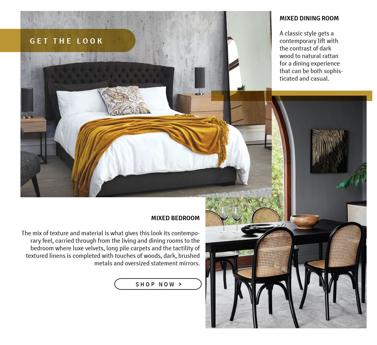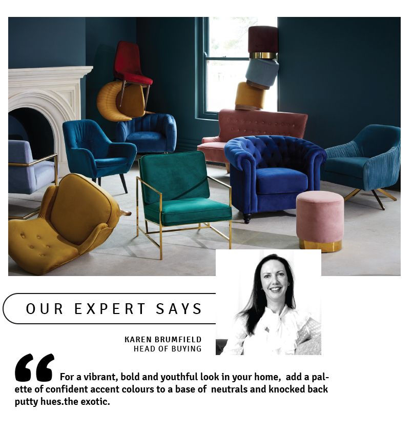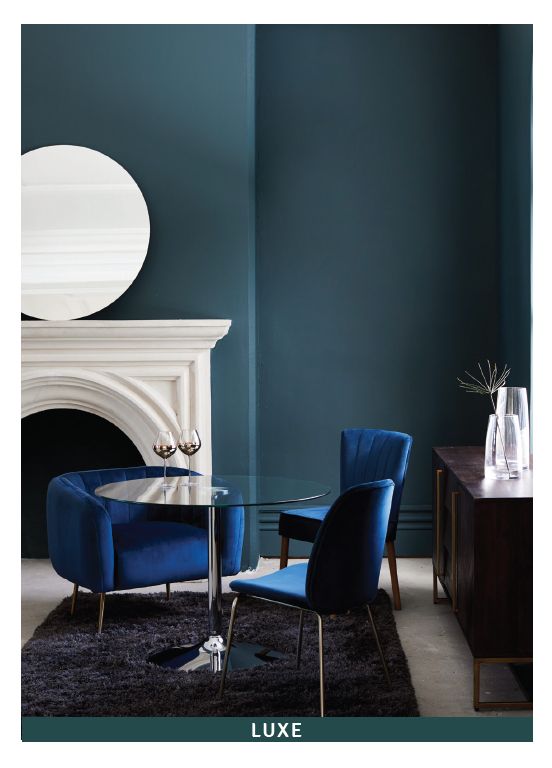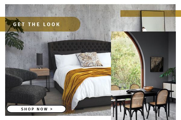 The mix of texture and material is what gives this look its contemporary feel, carried through from the living and dining rooms to the bedroom where luxe velvets, long pile carpets and the tactility of textured linens is completed with touches of woods, dark, brushed metals and oversized statement mirrors