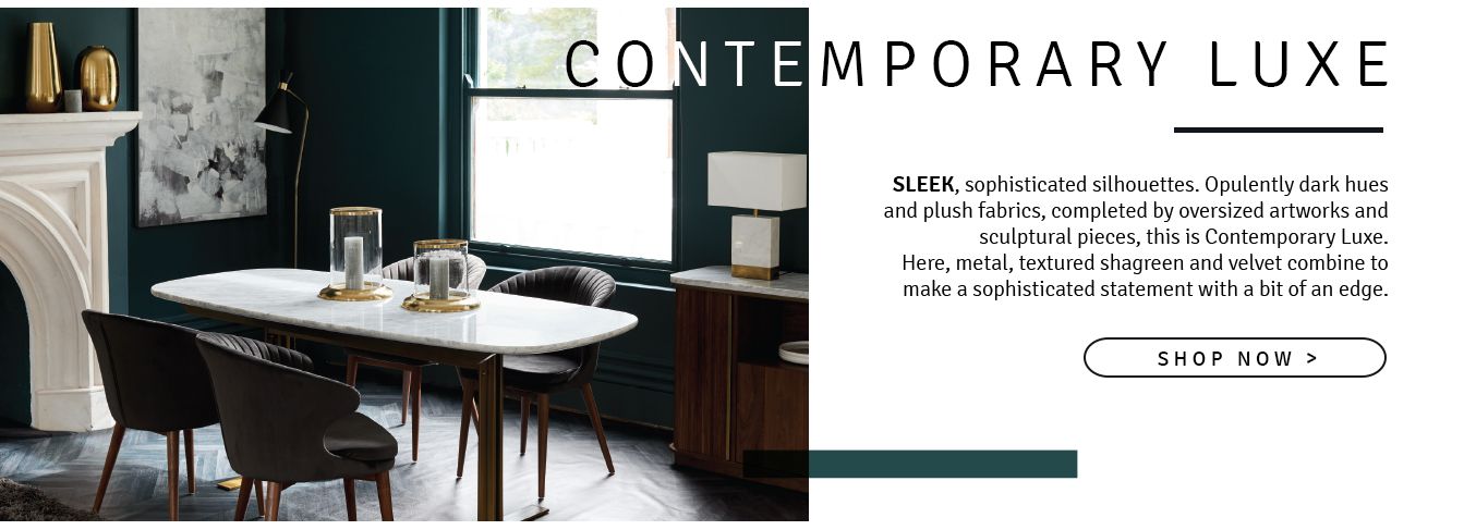 Sleek, sophisticated silhouettes. Opulently dark hues and plush fabrics, completed by oversized artworks and sculptural pieces, this is Contemporary Luxe. Here, metal, textured shagreen and velvet combine to make a sophisticated statement with a bit of an edge