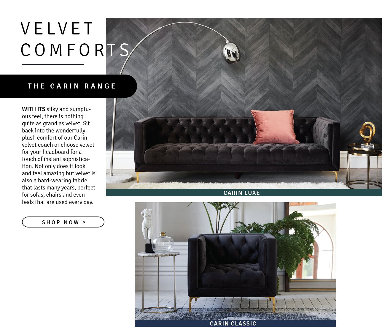 With its silky and sumptuous feel, there is nothing quite as grand as velvet. Sit back into the wonderfully plush comfort of our Carin velvet couch or choose velvet for your headboard for a touch of instant sophistication. Not only does it look and feel amazing but velvet is also a hard-wearing fabric that lasts many years, perfect for sofas, chairs and even beds that are used every day.