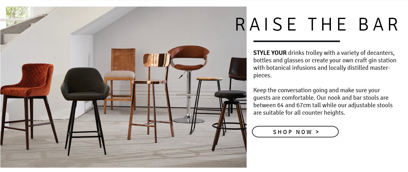 Keep the conversation going and make sure your guests are comfortable. Our nook and bar stools are between 64 and 67cm tall while our adjustable stools are suitable for all counter heights.