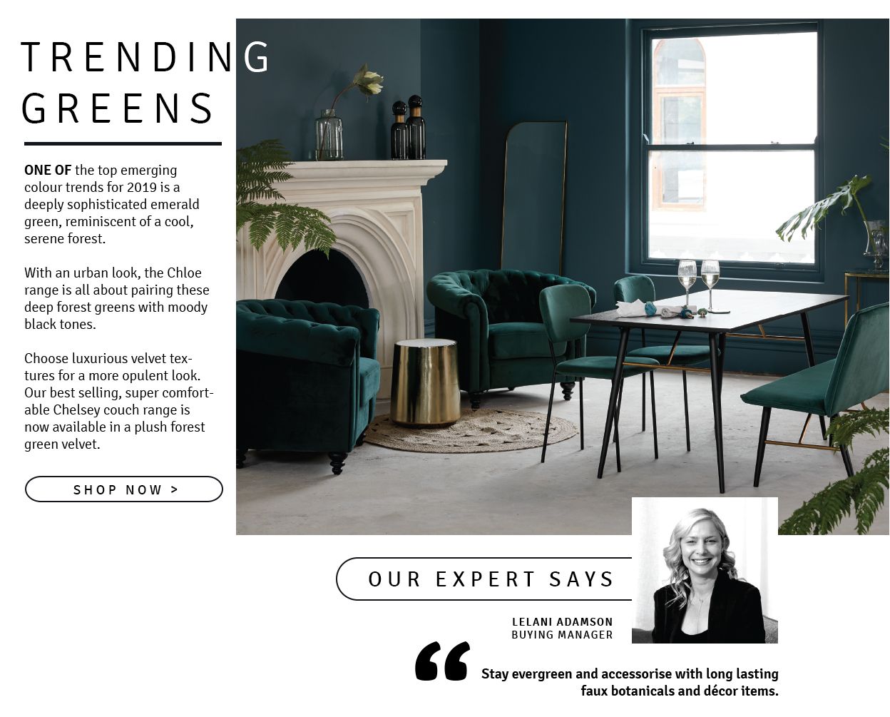 With an urban look, the Chloe range is all about pairing these deep forest greens with moody black tones.
